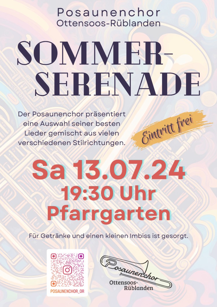 Pfarrgarten Ottensoos Gartenstraße 19, OttensoosHerzliche Einladung zur Sommerserenade des Posaunenchors Ottensoos-Rüblanden am Samstag, 13.07.24, um 19:30 Uhr im Pfarrgarten. Unser Chor möchte sich gerne wieder einmal im Rahmen eines…