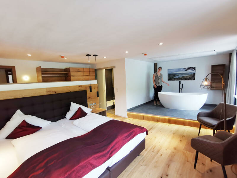 Ab diesem Augenblick begann sich das Paar „intensive Gedanken zu machen“. Beiden war klar, dass sie mit dem Haus weiterkommen wollen. Dazu müssten sie den Urlaubsgast, speziell Wellness-Suchende und Familien, nach Corona mehr in den Blick nehmen. Zimmer auf älterem Stand im Haupthaus empfanden die beiden dafür als nicht förderlich. „Und ohne Gäste konnten wir Lärm und Dreck machen.“ Also machte Erras den „Schäufele-Drive-in“ zu und peilte die Kernsanierung von 15 Räumen an – trotz Magenschmerzen. Denn: „Ein mittlerer sechsstelliger Bereich ist schon ein Wagnis in dieser Zeit.“ Zumal die Banken auf Sicherheiten bedacht seien. Viele Erklärungen und Zahlen hätten bei der Kreditvergabe aber für Verständnis gesorgt.