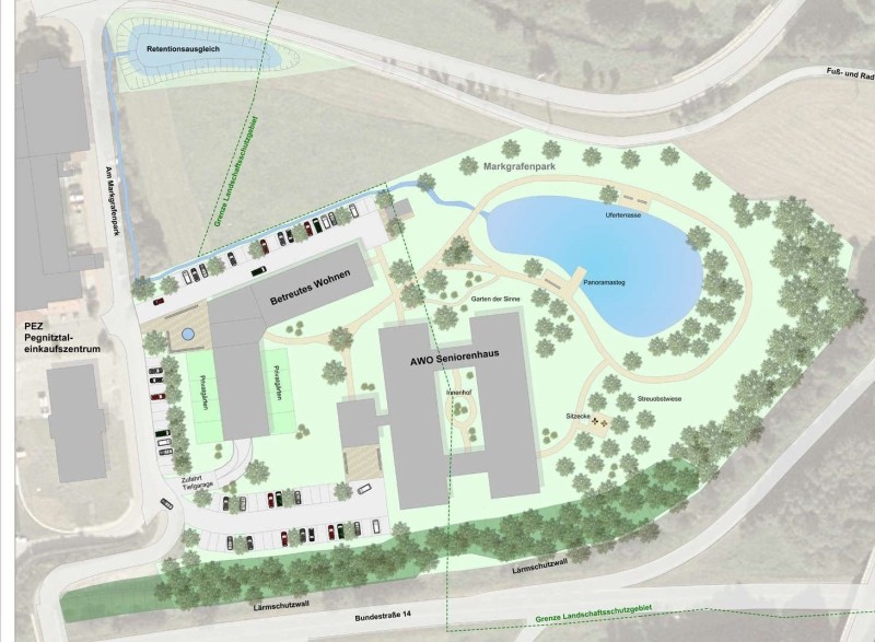 Im Pegnitztal-Einkaufszentrum (PEZ) bekommt das bereits vorgestellte Projekt „Betreutes Wohnen“ vielleicht noch Zuwachs. Wie Bürgermeister Jörg Fritsch erläuterte, könne daneben auch ein Seniorenhaus in „Co-Funktion“ mit dem AWO-Seniorenheim Pommelsbrunn entstehen. „Eine tolle Abrundung für das PEZ“ wäre dies, freute sich Fritsch, wobei jedoch erneut eine Herausnahme aus dem dort ausgewiesenen Landschaftsschutzgebiet zu beantragen sei. Der Kreistag hatte dies in der Vergangenheit skeptisch gesehen. Zusätzlich solle eine Parkanlage eingerichtet werden, genau passend zur Adresse „Am Markgrafenpark“.