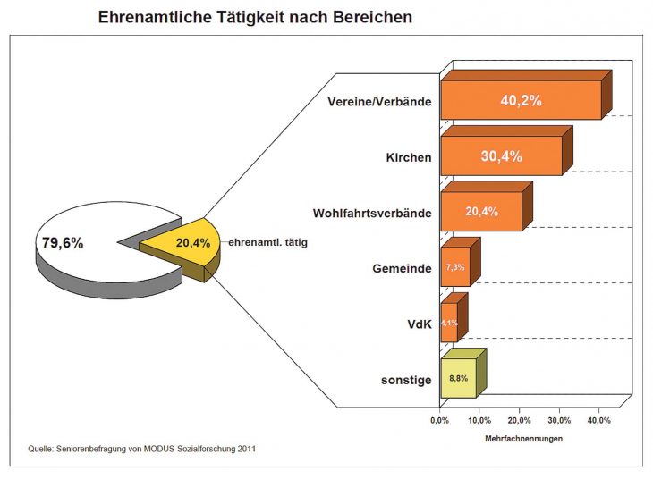 Senioren sind vor allem in Vereinen beziehungsweise Verbänden oder der Kirche ehrenamtlich aktiv. Diese beiden Bereiche machen mehr als 40 beziehungsweise 30 Prozent der ehrenamtlichen Tätigkeit. Dahinter rangieren mit gut 20 Prozent die Wohlfahrtsverbände, gefolgt von den Gemeinden mit etwa sieben Prozent und dem Sozialverband VdK mit gut vier Prozent. Die Befragung der Senioren ergab außerdem, dass Frauen überwiegend in der Kirche und bei Wohlfahrtsverbänden engagiert sind und Männer vor allem in Vereinen.