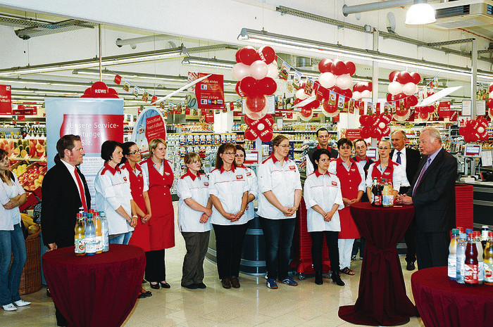 RÖTHENBACH — Zwei Jahre stand der frühere Comet schräg gegenüber dem Röthenbacher Bahnhof leer, jetzt hat die Kette Rewe hier wieder einen Supermarkt eröffnet. „Wir waren ja ein bisschen neidisch auf die Laufer, weil sie drei Rewe-Filialen hatten“, bekannte Bürgermeister Günther Steinbauer (r.) bei der offiziellen Eröffnung. Umso mehr freue er sich nun, dass dieser „traditionelle Röthenbacher Einkaufsort“ wiederbelebt worden sei. Im August 2010 hatte Rewe Interesse an der leer stehenden Immobilie bekundet, in der Zwischenzeit ist das Gebäude komplett entkernt und saniert worden. „Man erkennt kaum noch, dass das kein Neubau ist“, lobt Geschäftsführer Dominique Häber (l.). Der 28-jährige Laufer, der zuletzt die Filiale in der Nürnberger Straße als Marktleiter betreut hatte, hat sich nun als Franchise-Nehmer in Röthenbach selbstständig gemacht. 20 Mitarbeiter bieten unter seiner Regie auf 1700 Quadratmetern ein Sortiment von 12 000 Artikeln feil. In der Nähe zum Gewerbegebiet Speckschlag sieht man bei Rewe kein Problem: Hier sei schließlich kein Vollsortimenter zu finden, und die Edeka in der Rückersdorfer Straße sei zu klein für eine Stadt wie Röthenbach. Foto: Ziegler