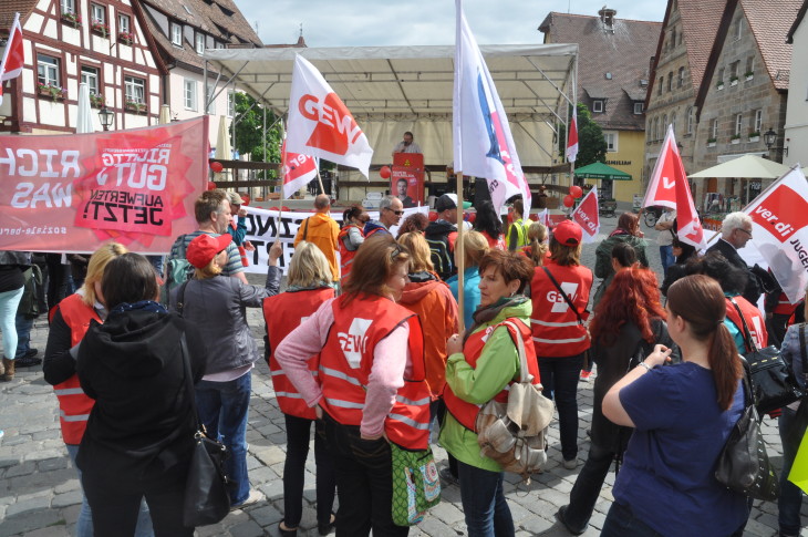LAUF — Gestern Vormittag um 10 Uhr fand auf dem Oberen Laufer Marktplatz eine Streikkundgebung der Gewerkschaft Verdi statt. Rund 100 Mitglieder von Verdi und GEW aus Behinderteneinrichtungen, Kitas aus dem Landkreis und Einrichtungen aus Nürnberg versammelten sich mit Plakaten, auf denen Sprüche wie „Endlich mehr Anerkennung für die Helden des Alltags“ zu lesen standen. Zur Veranstaltung aufgerufen hatte der Verdi-Fachbereich 3 in Mittelfranken, der für die Behindertenhilfeeinrichtungen zuständig ist. Dessen Gewerkschaftssekretär Bernhard Bytom sagte der PZ: „Auch hier im Nürnberger Land gibt es Politiker, die Sitz und Stimme im Arbeitgeberverband haben. Von denen erwarten wir natürlich, dass sie ihre Möglichkeiten zum Nutzen ihrer Beschäftigten geltend machen.“ Schließlich, so Bytom, ist beispielsweise der Landtagsabgeordnete Norbert Dünkel Geschäftsführer der Lebenshilfe im Nürnberger Land, Laufs Bürgermeister Benedikt Bisping zuständig für die Kitas in der Kreisstadt und Landrat Armin Kroder für alle im Nürnberger Land. In seiner Rede forderte der Verdi-Vertreter, dass Erzieher und Menschen, die in sozialen Berufen arbeiten, „angemessen bezahlt werden“. Neben Bytom standen zwei Betriebsräte der Lebenshilfe Nürnberger Land, Angela Merkl und Peter Meidenbauer, sowie von der Gewerkschaft GEW Gerd Schnellinger auf der Bühne. Foto: Kirchmayer
