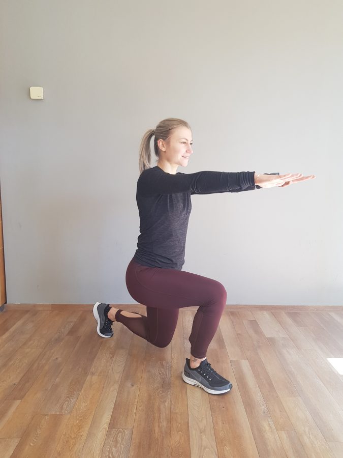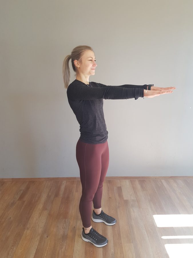 Ausgangsstellung (a): Etwas weiter als hüftbreiter Stand. Füße werden so aufgestellt, dass Knie und Zehen leicht nach außen rotiert sind. Der Rumpf ist gerade und der Bauch angespannt. Die Arme werden waagrecht vor dem Körper gehalten.